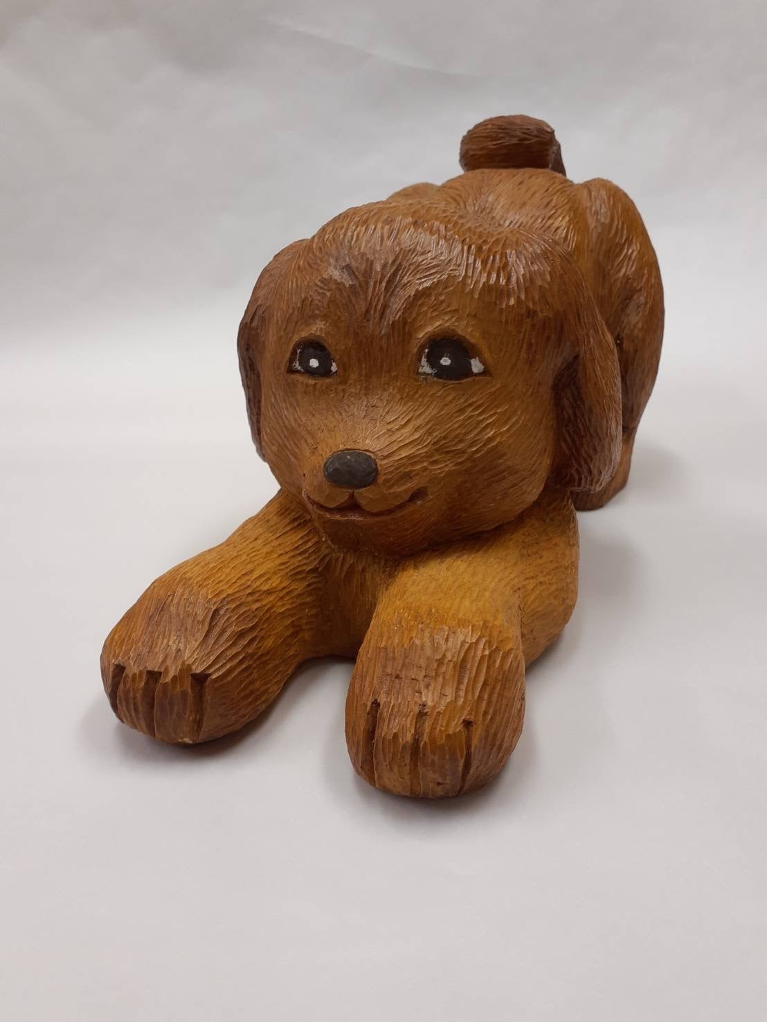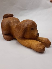 伸びをする犬の木彫